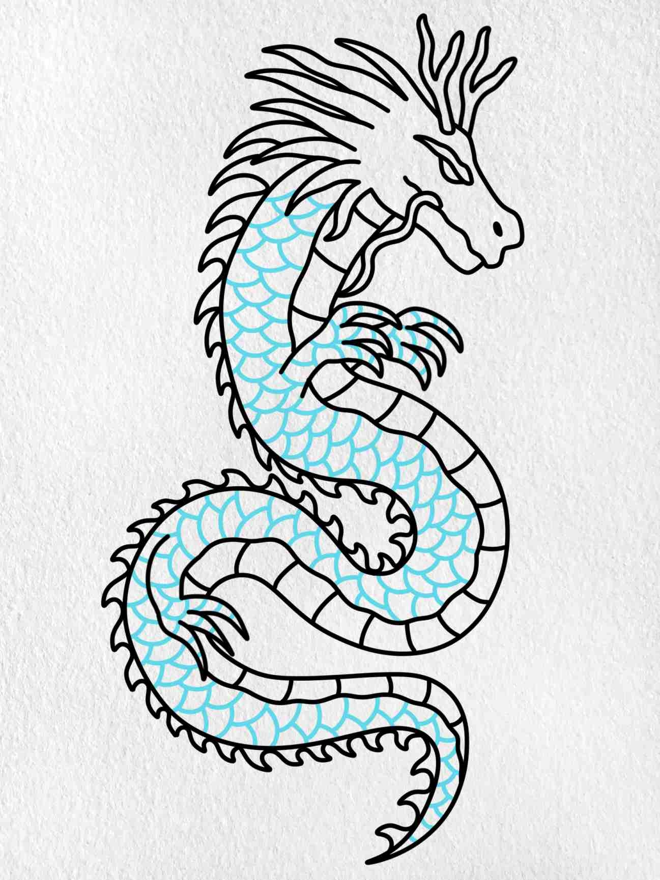 Begin by sketching the basic shapes of the dragon. Start with the head, which is typically shaped like a triangle with a rounded snout. Next, draw the body using curved lines to create the long, serpentine shape of the dragon. Add the legs and tail, making sure to keep the proportions in mind.