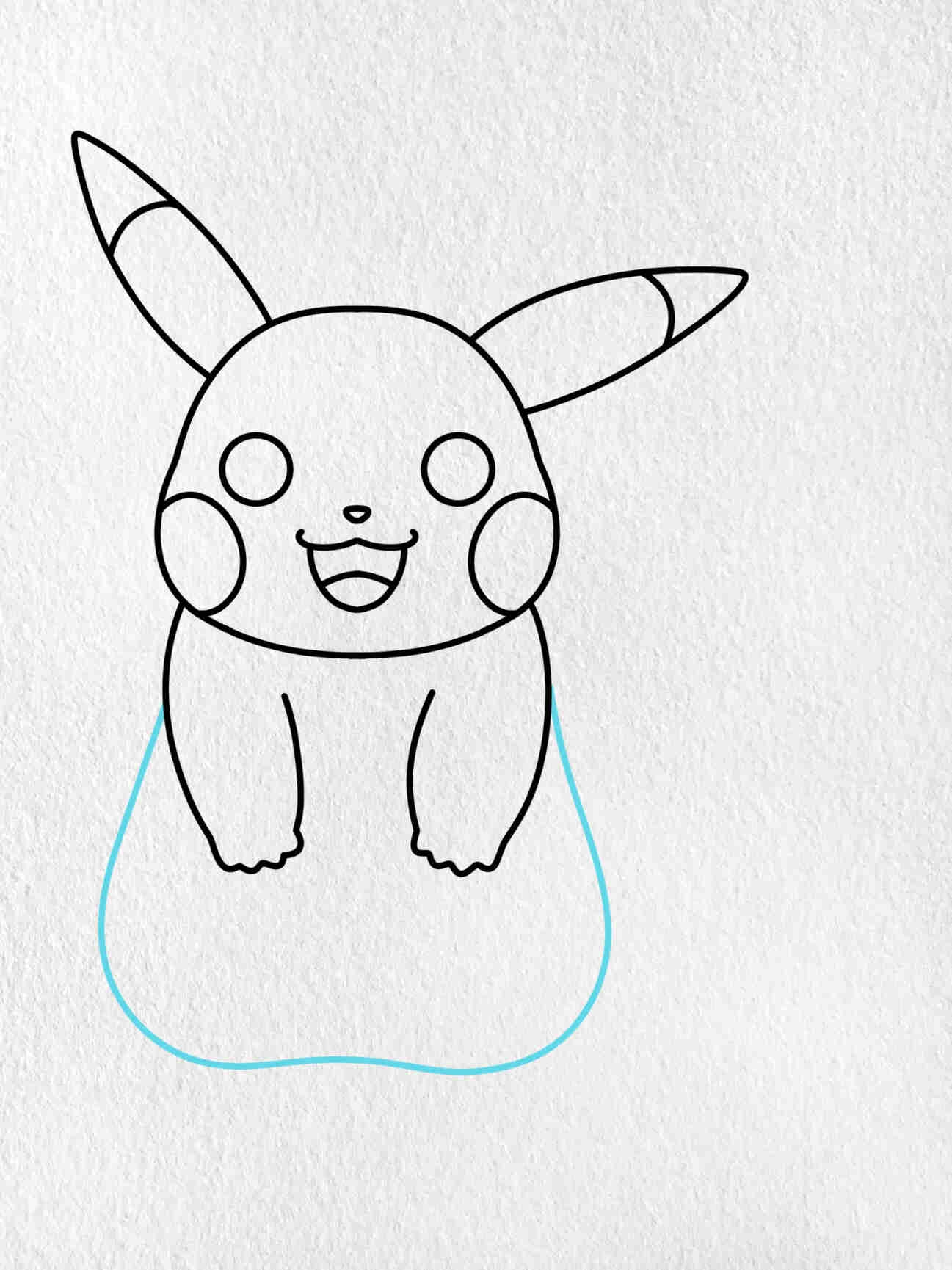 Now, it’s time to draw Pikachu’s body. Start by drawing a large oval shape for the body and two small oval shapes for the arms. Add curved lines for the fingers and a zigzag line for the tail. Don’t forget to add Pikachu’s signature lightning bolt-shaped tail at the end.