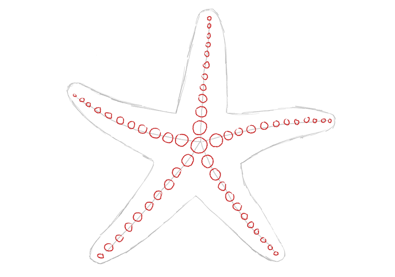 First, start by sketching the basic outline of the starfish. They typically have five arms radiating from a central point, creating a symmetrical shape. Pay attention to the proportions and angles of the arms to capture the starfish’s natural symmetry.