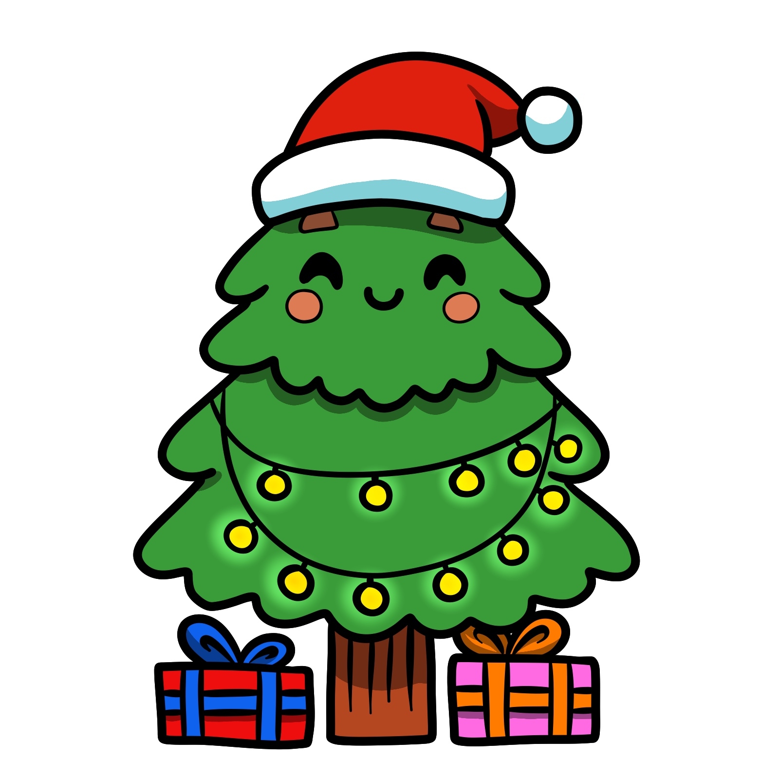 How To Draw A Cute Kawaii Christmas Tree With A Santa Hat And Gifts