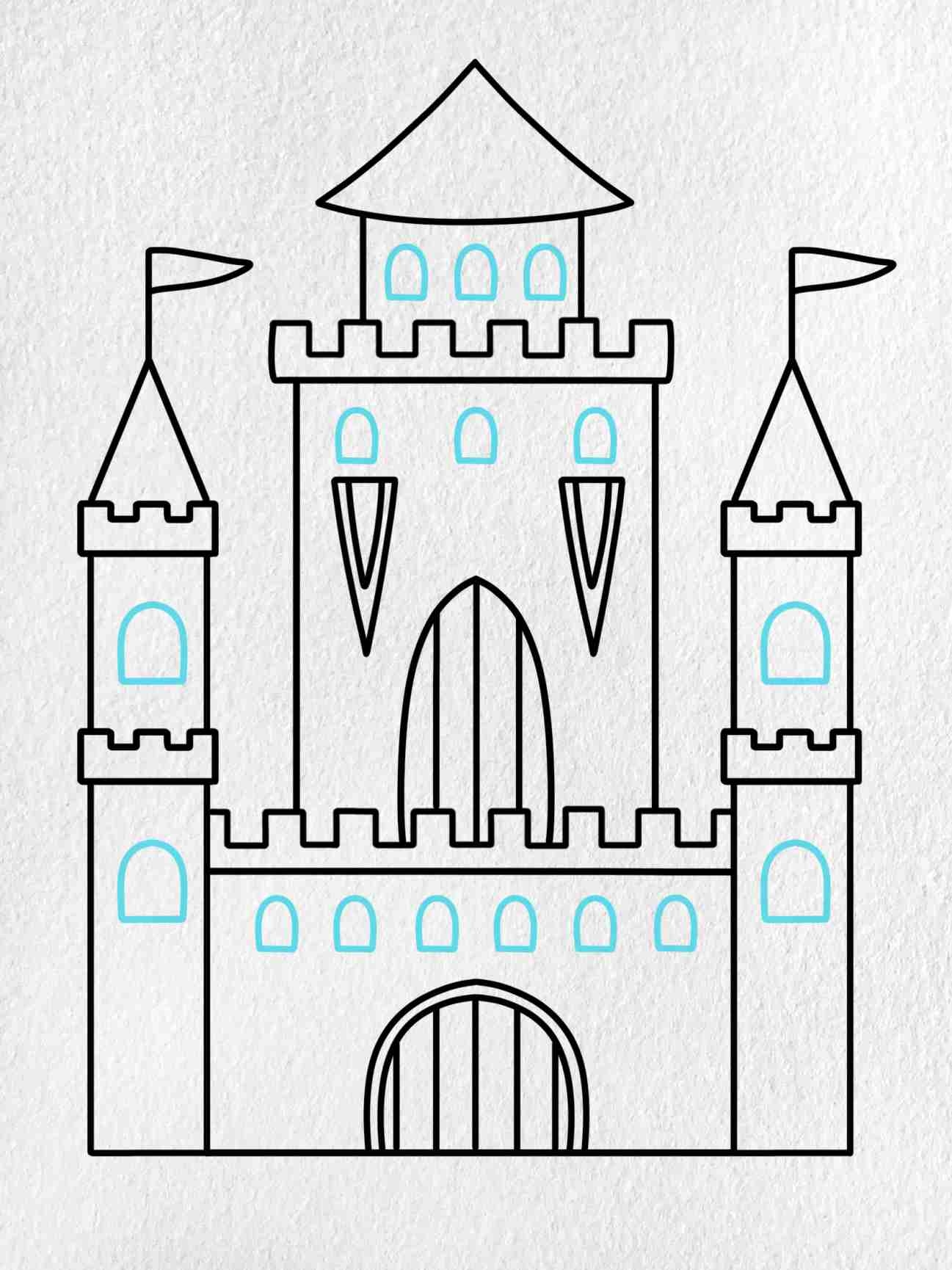 Start by drawing the basic outline of the castle. Begin with the main structure, which is usually a rectangular or square shape. Add towers at each corner to give the castle a more traditional look. You can also include a gatehouse in the center for added detail.