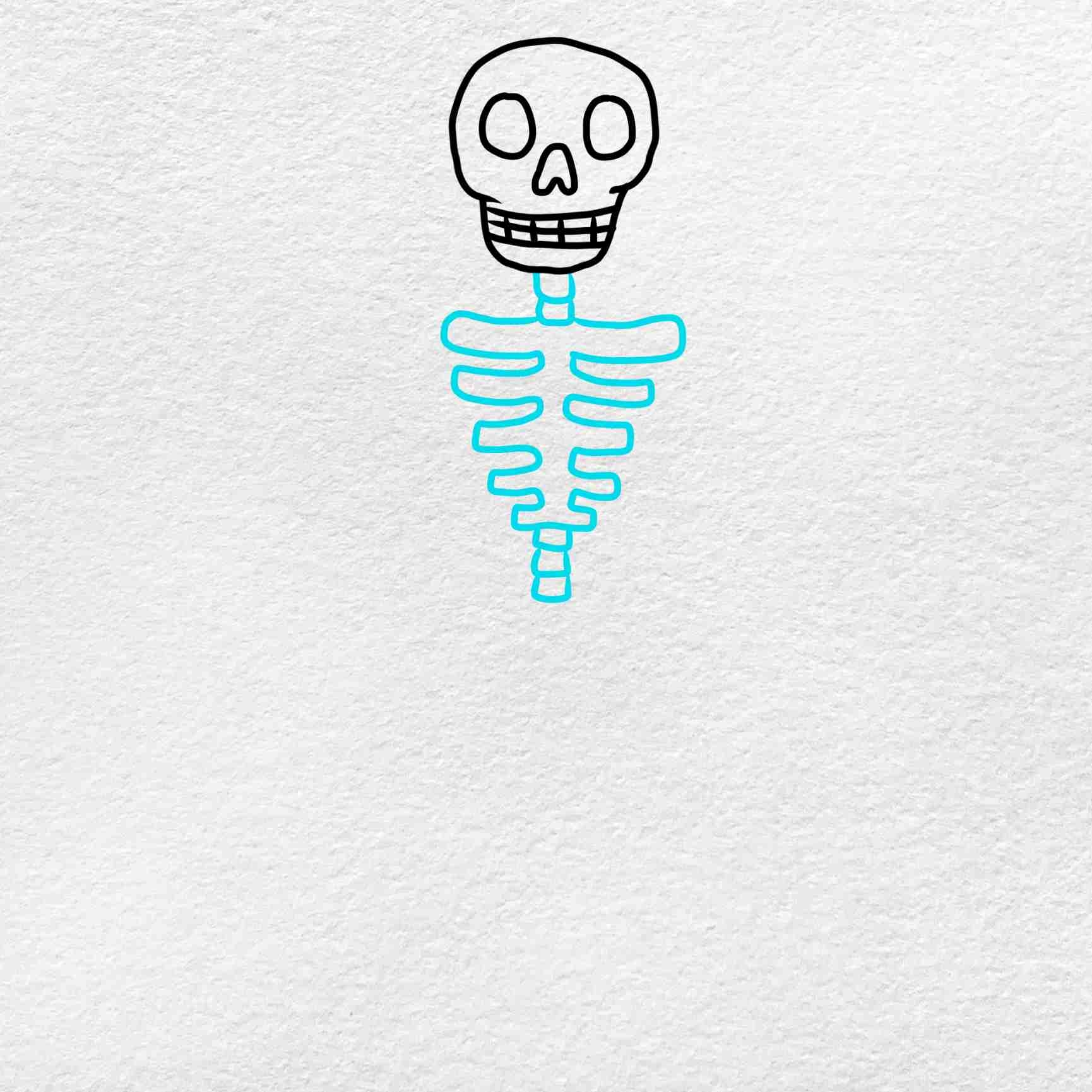 Once you have the head in place, draw a vertical line extending down from the bottom of the head to create the spine. Then, add two horizontal lines across the spine to represent the shoulders and hips. Connect the shoulders and hips with curved lines to create the ribcage and pelvic bones.