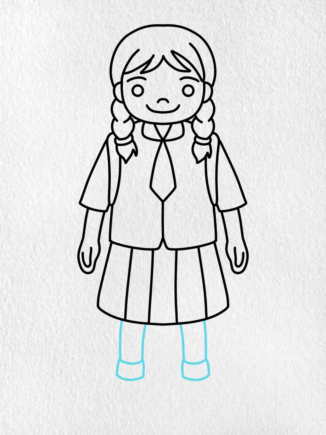 Start by sketching the basic outline of the girl’s face and body. Use simple shapes like circles and ovals to create the head, body, and limbs. Don’t worry about adding too many details at this stage, just focus on getting the basic proportions and shapes right.
