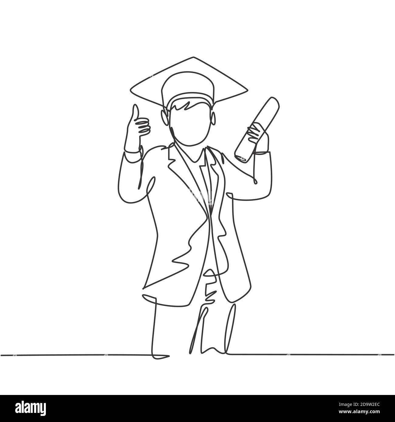 One Line Drawing Of Young Happy Boy Student Wearing Graduation Hat