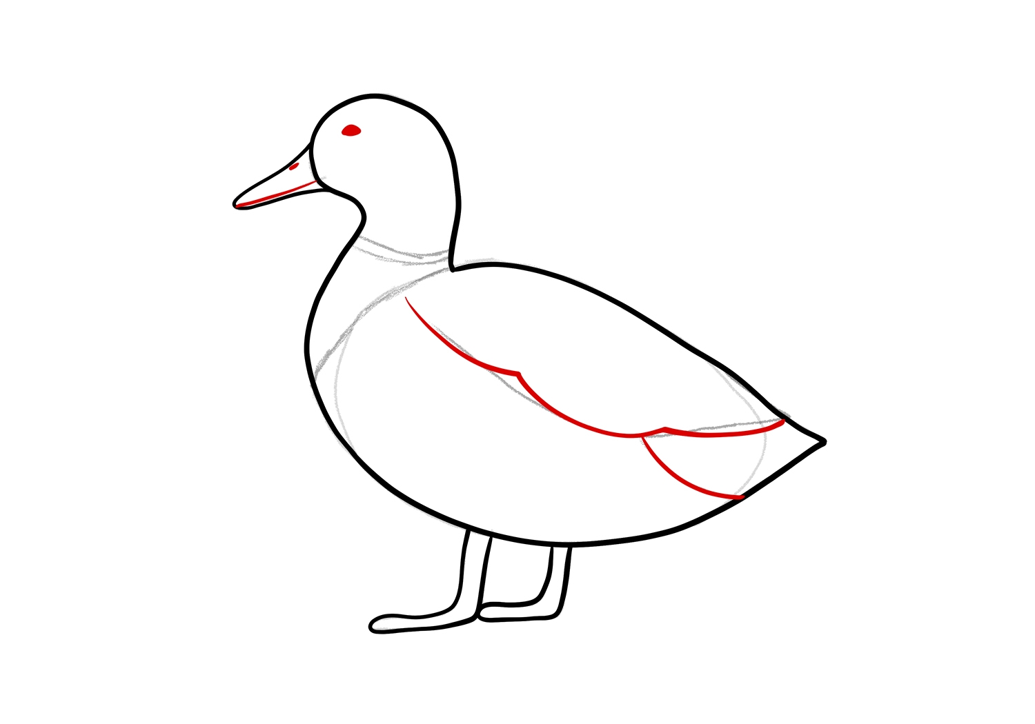 Now it’s time to add the details that will bring your duck drawing to life. Draw a small triangle for the beak at the front of the head shape. Next, draw two small circles for the eyes above the beak. Add a curved line for the smile below the beak to give your duck a friendly expression.