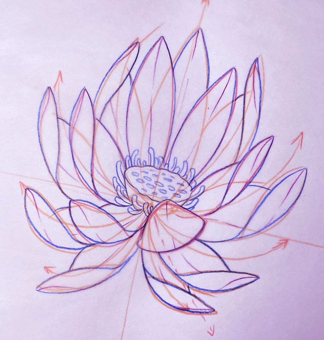 3. Continue adding more petals around the center, making them larger and wider as you move outward. The lotus flower has a symmetrical and balanced appearance, so try to keep the petals evenly spaced.