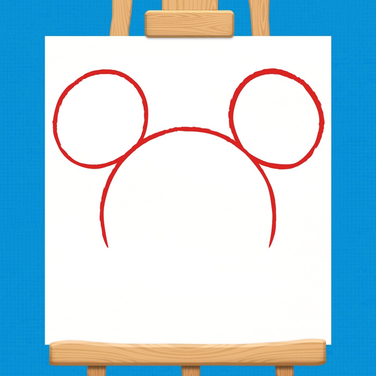 5. Finally, add two small circles above the eyes for Mickey’s eyebrows, and draw his iconic round ears with a few simple lines.