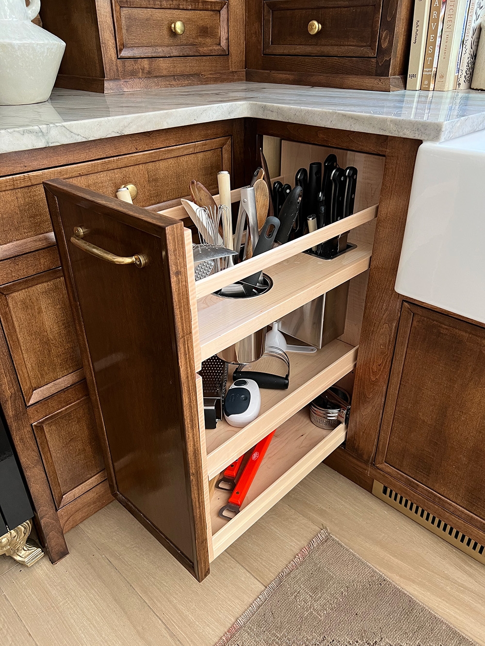 Corner drawers are a great solution for utilizing the often underutilized corner space in kitchen cabinets. These drawers are usually L-shaped and provide easy access to items that would otherwise be difficult to reach. Additionally, there are also specialty drawers available for storing specific items such as pots and pans, cutting boards, and spice jars.