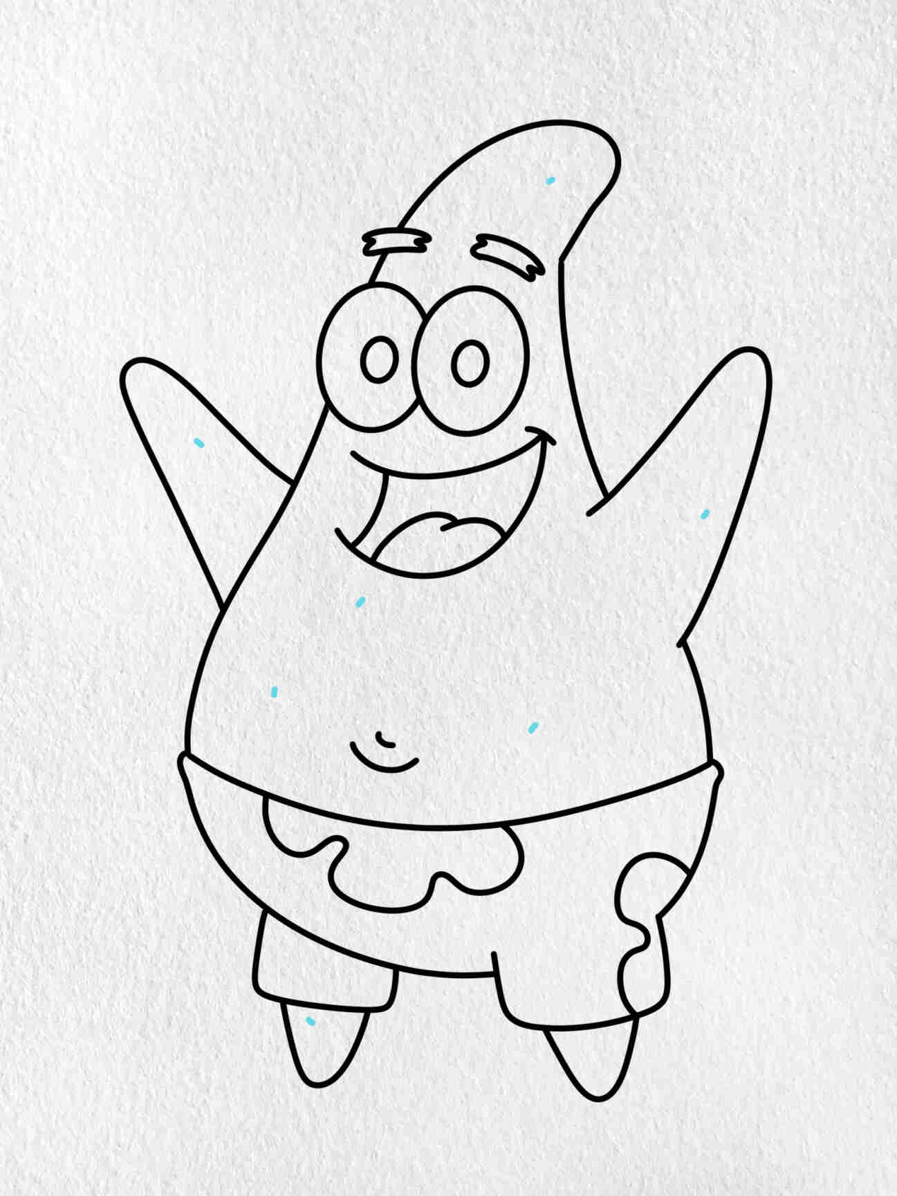 Next, add details such as his signature pink shorts and green tie. Don’t forget to include his iconic belly button and freckles, as these small details can add depth and character to your drawing.